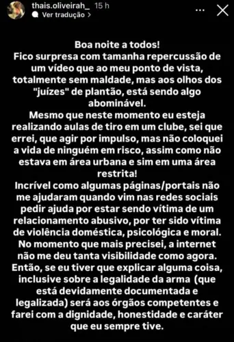 Diante das críticas, Thaís se pronunciou por meio de seu Instagram, afirmando que não colocou a vida de ninguém em risco. Ela também informou que a arma está “devidamente legalizada e documentada”.