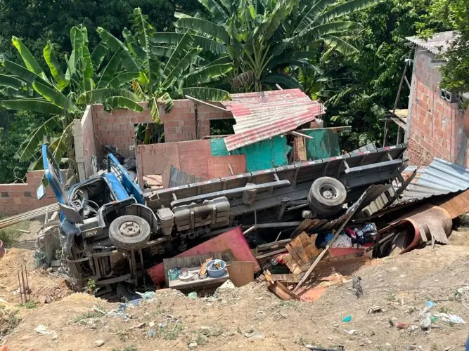 O acidente ocorreu na Rua 7, por volta das 11h15, após o caminhão descer uma ladeira desgovernado e tombar sobre a residência. O veículo já estava estacionado e fazia uma entrega de cimento quando não suportou o peso e desceu de ré.