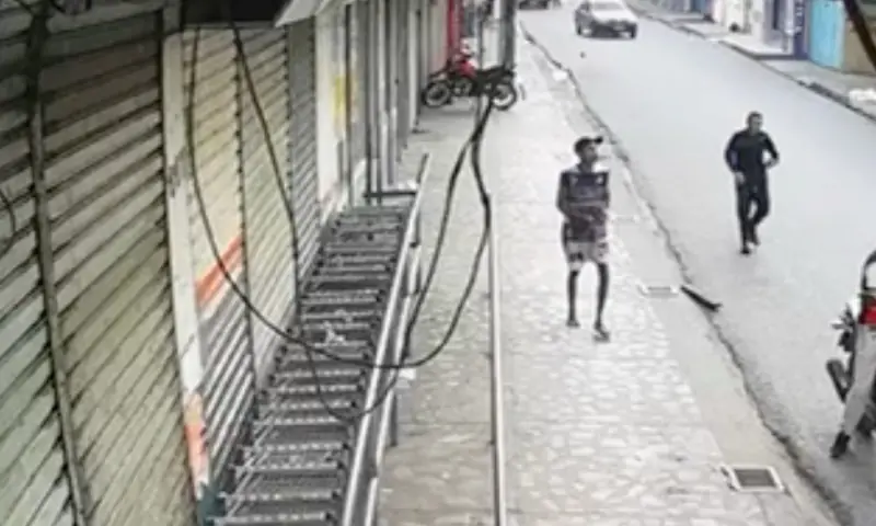 Câmeras de segurança flagraram o momento em que um homem ainda não identificado foi brutalmente esfaqueado na manhã desta sexta-feira (29), na rua Yanomami, bairro Novo Israel, zona Norte da capital amazonense. Nas imagens, é possível ver o momento em que a vítima é perseguida por dois homens. Um deles, armado com uma faca, desfere diversos golpes pelo corpo da vítima; enquanto o outro, com um pedaço de pau em mãos, também ataca o homem, que fica caído no meio da rua, ensanguentado e à beira da morte.
