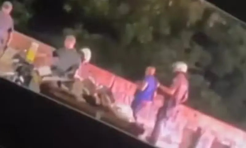 Um segundo e um terceiro policial se aproximam. Depois, o primeiro PM encosta a moto perto da ponte. Um quarto policial chega segurando o homem pela camiseta azul, que seria o motociclista abordado. Ele se aproxima da beirada da ponte e joga o homem no rio.