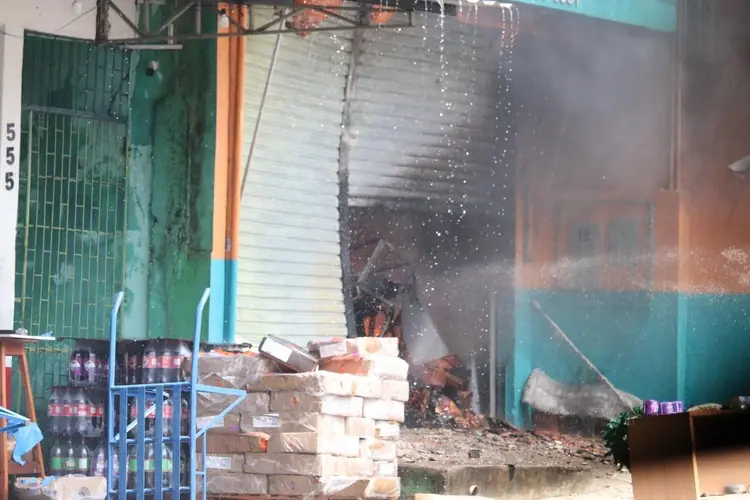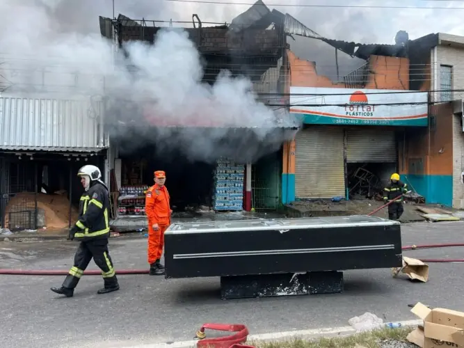 Manaus/AM – Mais de 20 horas depois do início de um incêndio que atingiu 12 estabelecimentos comerciais na Rua do Fuxico, na zona leste, os bombeiros continuam no local e trabalham no rescaldo e combate as chamas nos imóveis nesta quarta-feira (4).