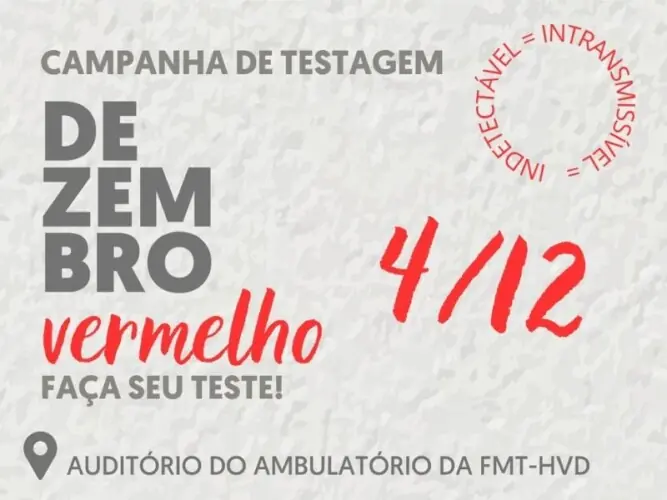 Manaus (AM) – A Fundação de Medicina Tropical Doutor Heitor Vieira Dourado (FMT-HVD), vinculada à Secretaria de Estado de Saúde (SES-AM), irá promover atividades em alusão a campanha “Dezembro Vermelho”, mês de combate ao HIV/Aids. A unidade realizará ações de testagens rápidas gratuitas e um simpósio voltado à atualização de profissionais da saúde.