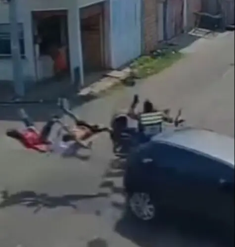 Imagens de câmeras de segurança mostraram que o mototaxista trafegava entre as ruas C e D, com um casal e uma criança na garupa, quando ao atravessar o cruzamento, é surpreendido pelo carro e colide com a lateral dele.