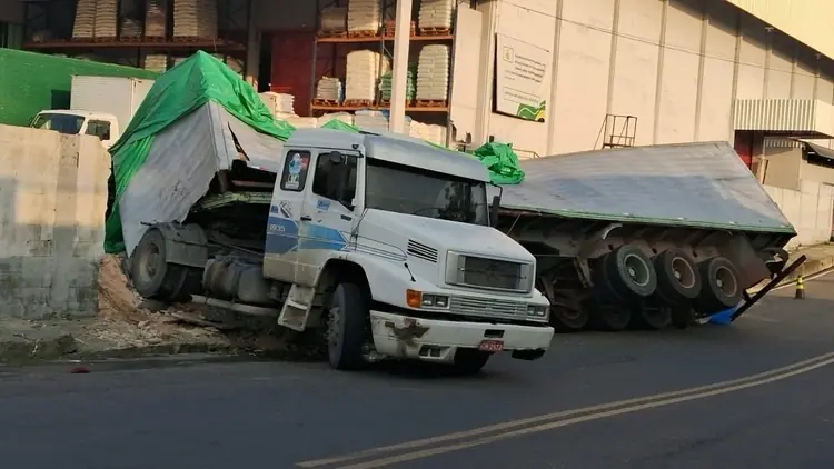 A carreta atingiu e derrubou parte do muro de uma empresa de embalagens, dois veículos que estavam estacionados dentro do estabelecimento também foram batidos e danificados.