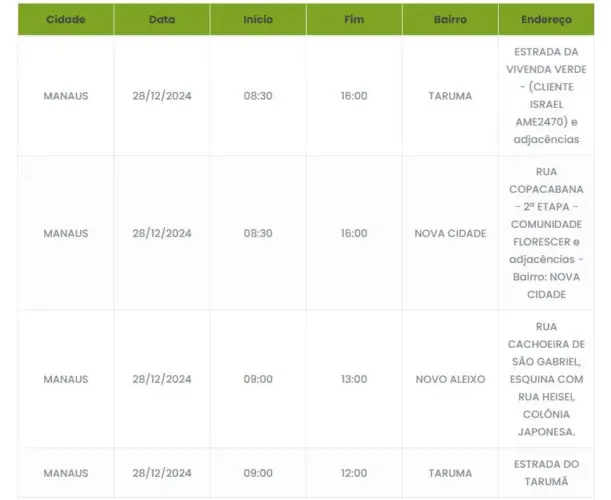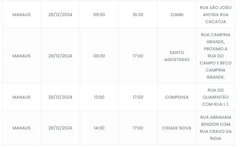 O desligamento programado deve afetar moradores do Tarumã, Nova Cidade, Compensa, Zumbi, Santo Agostinho, Novo Aleixo e Cidade Nova em ruas específicas.