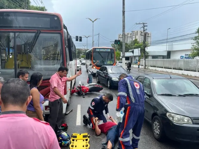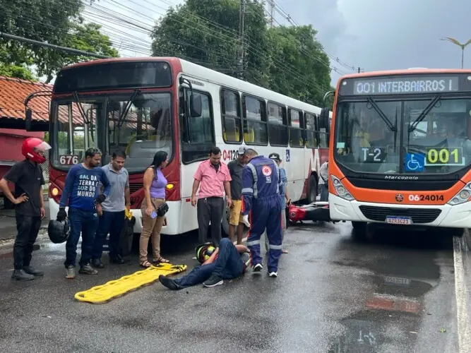 Ele teria se desequilibrado e atingido o ônibus que estava parado e por pouco não foi esmagado pelo segundo veículo. O Samu foi acionado e o motociclista foi socorrido com uma fratura na perna.
