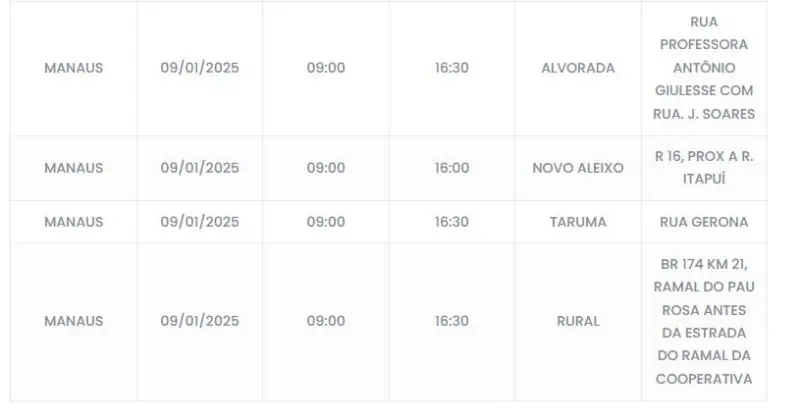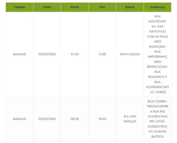 Os bairros afetados serão Novo Aleixo, Alvorada, Tarumã e Nossa Senhora das Graças. A interrupção deve durar ao menos cinco horas, confira o cronograma.