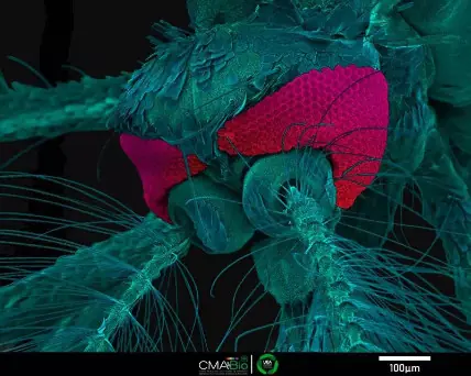 Com o título “Infectious Look” (“Aparência infecciosa”, traduzido para português), a imagem produzida pelo tecnólogo em microscopia e bolsista do Fundo de Reserva Específico de Pesquisa, Desenvolvimento e Inovação Tecnológica (FEPD&I) da UEA, Jander Matos, e por Joaquim Nascimento, doutorando em Biologia Evolutiva & Conservação do Instituto Nacional de Pesquisas da Amazônia (Inpa), apresenta detalhes dos olhos e da estrutura frontal do mosquito Aedes aegypti, espécie que transmite dengue, chikungunya, zika e a febre amarela urbana.