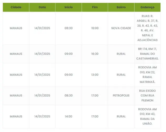 Manaus/AM- Os bairros Petrópolis e Nova Cidade vão receber manutenção na rede elétrica local de algumas ruas específicas nesta terça-feira (14). Por conta disso, o serviço será interrompido enquanto durar o serviço.