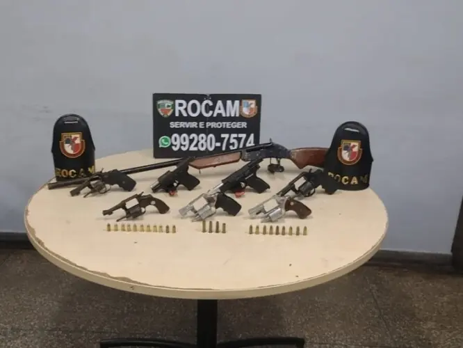 No local foram apreendidos 5 revólveres, 2 pistolas e 1 escopeta. Ele informou que dormia na casa para viagiar o armamento.