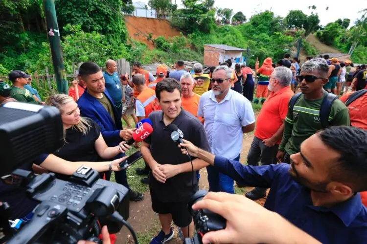 Durante a atuação da prefeitura no acolhimento e na busca às famílias atingidas pelo deslizamento no bairro da Redenção, o vice-prefeito e secretário de Obras, Renato Junior, explicou o trabalho realizado. “Houve um deslizamento de terra por conta de uma ligação irregular de tubulação de água na rua de cima, que infiltrou e fez com que esse barranco caísse em cima dessas casas. Uma pessoa foi beneficiada na rua de cima e todo o restante foi prejudicado. As máquinas não poderiam ser colocadas aqui dentro, porque é de difícil acesso”, disse Renato Junior, enquanto acompanhava as buscas.