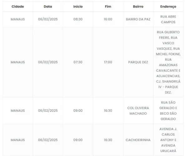 Manaus/AM – Moradores e comerciantes de cinco bairros da capital ficarão sem energia nesta quinta-feira (5), devido ao desligamento programado para manutenção.