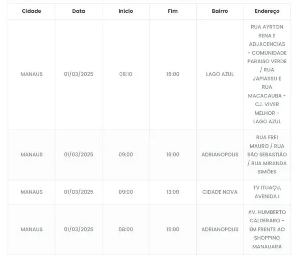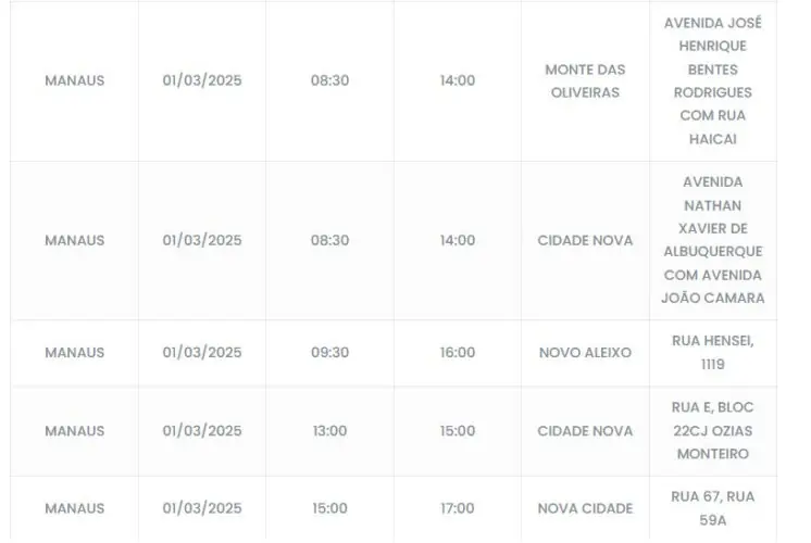 Manaus/AM- O desligamento da rede elétrica, programado para este sábado (1), deve afetar moradores e comerciantes de seis bairros em Manaus. A maioria deles estão localizados na zona norte.
