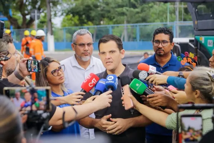 O prefeito de Manaus em exercício e titular da Secretaria Municipal de Infraestrutura (Seminf), Renato Junior, concedeu, na tarde desta segunda-feira, 3/3, entrevista coletiva sobre a etapa final de asfaltamento da via no canteiro de obras na avenida Maceió, trecho entre a avenida Salvador e a rotatória em frente ao Parque Municipal do Idoso (PMI).