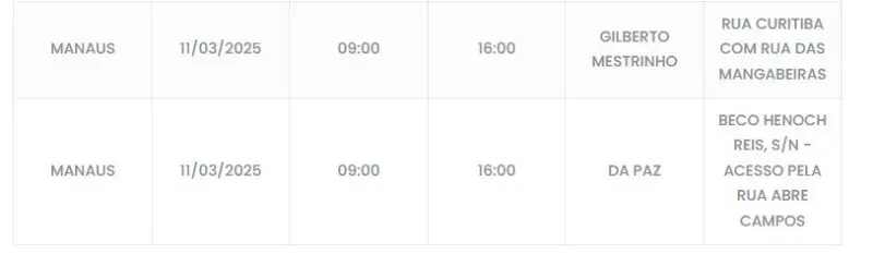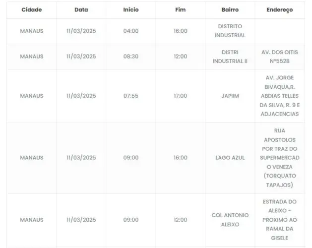 Manaus/AM – Sete bairros ficarão sem energia nesta terça-feira (11) devido à manutenção que está programada para os locais a partir das 4h.