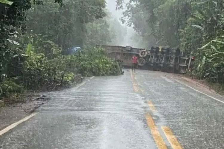 O motorista do caminhão contou a polícia que tentou desviar da árvore e na tentativa de evitar a colisão, o veículo acabou tombando e ficou atravessado na pista.
