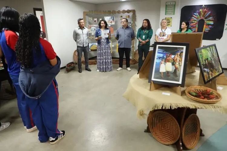 Estudantes destaques do 9º ano da Escola Municipal Carolina Perolina, localizada no bairro São José Operário, zona Leste, participaram, nesta terça-feira, 6/5, da abertura da exposição “Universos Culturais Indígenas Amazônicos”, realizada pela Prefeitura de Manaus, por meio da Secretaria Municipal de Educação (Semed). A atividade aconteceu no Espaço da Cidadania Ambiental (Ecam), situado no Manauara Shopping, coordenado pela Ocas do Conhecimento Ambiental (Ocas), setor vinculado à Semed e a Vara do Meio Ambiente do Tribunal de Justiça do Amazonas (Vema/TJ-AM).