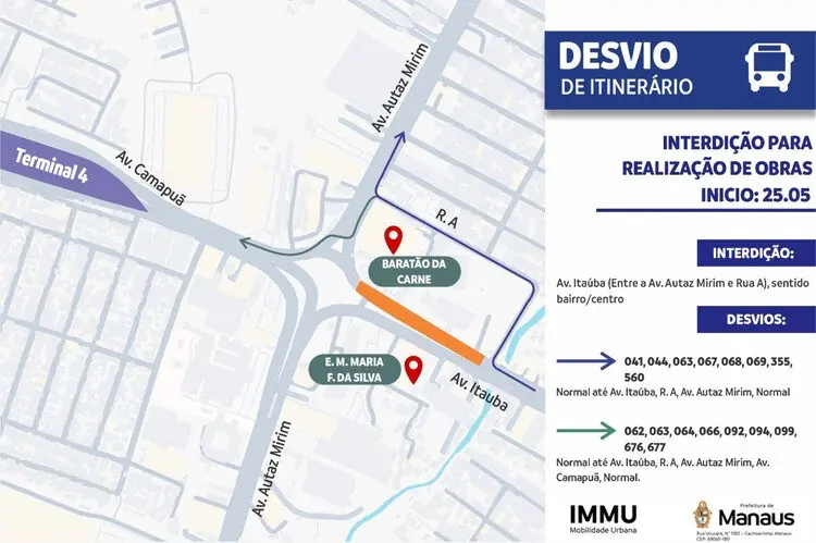 Durante esse período, o tráfego de veículos no sentido da rotatória do produtor será desviado: os motoristas deverão acessar a rua Três Rios à direita e, em seguida, virar à esquerda na rua A, para retomar o caminho pela avenida Autaz Mirim.