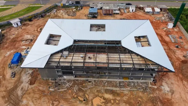 Instalações de forro externo e tubulações de condicionador de ar são feitas, assim como as paredes internas em gesso acartonado. A previsão é de entregar a obra no segundo semestre de 2025.