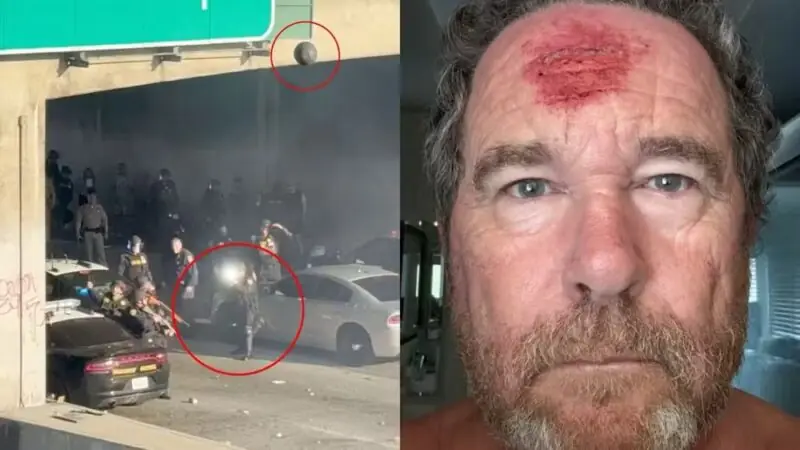 Toby Canham, de 59 anos, registrou com sua câmera o momento em que um dos policiais, que combatia protestos contra as políticas anti-imigração do governo Trump, mirou em sua direção e disparou o projétil, que é visível na filmagem.