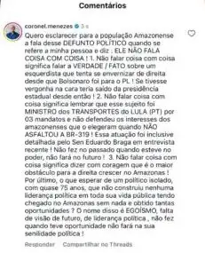 “Não falar coisa com coisa significa falar a VERDADE sobre um ex-ministro que esteve por três mandatos à frente dos Transportes, no governo Lula, e NÃO asfaltou a BR-319”, escreveu Menezes, referindo-se a uma das pautas mais simbólicas da infraestrutura da região Norte.