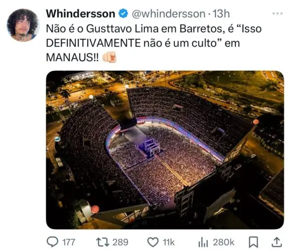 Nas redes sociais, Whindersson agradeceu ao público manauara e reforçou o carinho que tem pela cidade. “Eu me entrego muito nesse show, e sinto que vocês se entregam ao riso e ficam hipnotizados com as histórias!”