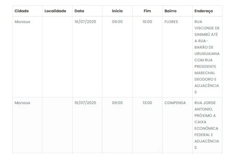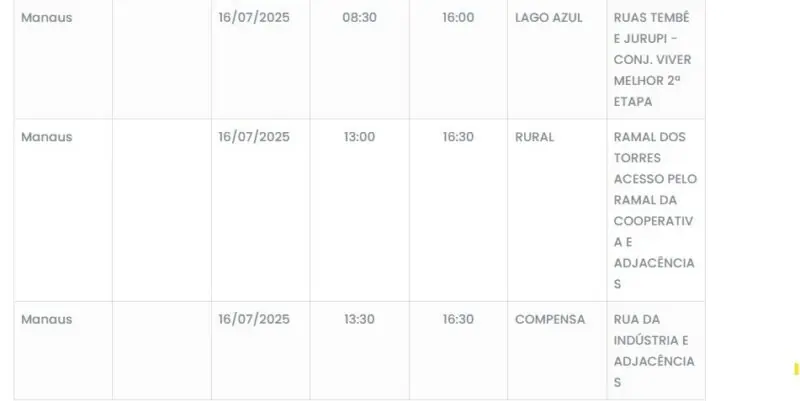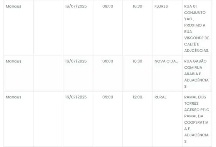 AlertaManausNotícias Quatro bairros e zona rural de Manaus ficarão sem energia nesta quinta-feira Publicado por: in9 news 15/07/2025 Compartilhado FacebookTwitterPinterestWhatsApp Conteúdo relacionado Amazonas tem previsão de tempestades e alagamentos nesta segunda-feira 16/03/2026 Criança de 4 anos morre afogada em piscina de sítio na estrada de Iranduba 16/03/2026 Eduardo Braga anuncia obras e investimentos para a zona rural de Itacoatiara 15/03/2026 in9 news Manaus/AM – Quatro bairros da cidade ficarão sem energia nesta quarta-feira (16), devido ao serviços de manutenção que estão programados para ruas e avenidas específicas de cada um deles. Compartilhe isso: Compartilhar no Facebook(abre em nova janela) Facebook Compartilhar no X(abre em nova janela) 18+ Compartilhar no LinkedIn(abre em nova janela) LinkedIn Compartilhar no Telegram(abre em nova janela) Telegram Compartilhar no Threads(abre em nova janela) Threads Compartilhar no WhatsApp(abre em nova janela) WhatsApp Compartilhar no Bluesky(abre em nova janela) Bluesky Notícias Relacionadas Compartilhado FacebookTwitterPinterestWhatsApp Notícia anteriorAmazonas registra saldo positivo em junho com exportações de ouro e motosPróxima notíciaEmpresário é executado a tiros e homem fica ferido em ataque na Compensa - Publicidade - Últimas notícias Amazonas tem previsão de tempestades e alagamentos nesta segunda-feira 16/03/2026 Reformas ampliam acesso ao esporte e lazer na Compensa com ações do Governo do Amazonas 16/03/2026 Criança de 4 anos morre afogada em piscina de sítio na estrada de Iranduba 16/03/2026 Escola do Legislativo da CMM abre inscrições para cursos de informática e inglês em Manaus 16/03/2026