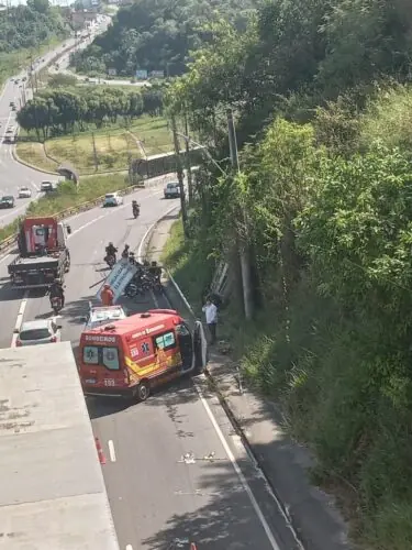 O acidente ocorreu por volta das 10h e assustou condutores que passavam pelo local. No momento, o veículo perdeu a direção, colidiu com a estrutura de uma placa de sinalização e em seguida atingiu um talude.