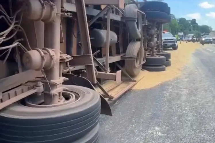 Uma carreta bitrem, que estava carregada de soja, tombou na manhã desta segunda-feira (25), no início da Avenida das Flores, por trás do Parque Sumaúma, no bairro Cidade Nova, na zona norte.