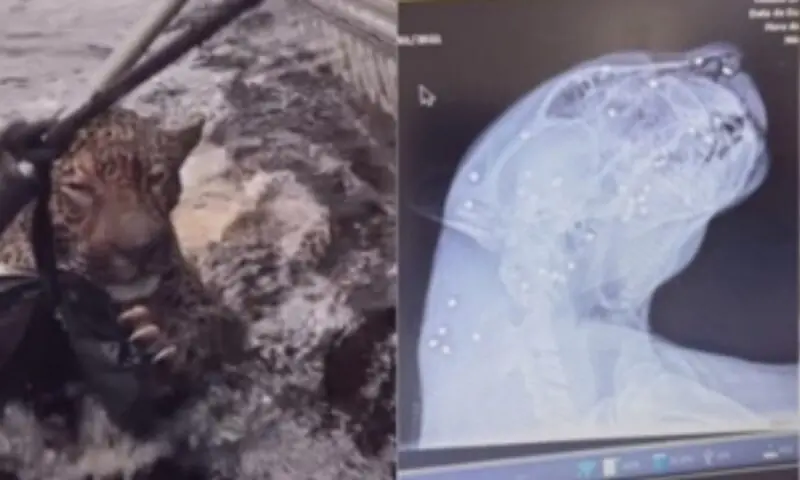 A onça-pintada resgatada nesta quarta-feira (1º), após ser flagrada nadando por horas e demonstrando sinais de exaustão no Rio Negro, no Amazonas, estava em estado crítico. O animal apresentava ferimentos graves, com intenso sangramento, dentes quebrados e sinais de profundo desgaste físico. Exames realizados após o resgate confirmaram que ele havia sido atingido por disparos de arma de fogo, acumulando mais de 30 projéteis alojados no corpo.