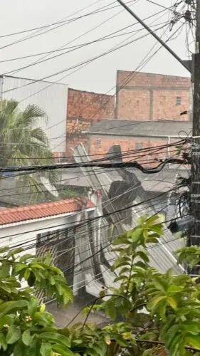 A tampa da caixa d’água da residência foi arremessada e caiu sobre um carro, enquanto o telhado acabou sendo levado pelo vento e foi parar do outro lado da rua. Por sorte, ninguém ficou ferido.
