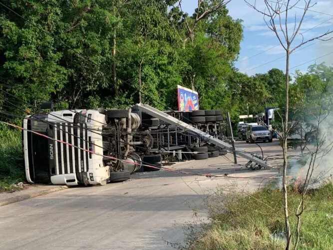 Um acidente de trânsito paralisou o tráfego em uma via de Manaus, após uma carreta tombar sobre um poste, derrubar a fiação elétrica e provocar um princípio de incêndio em um canteiro central. A fiação, que permaneceu ativa, também caiu sobre um ônibus.