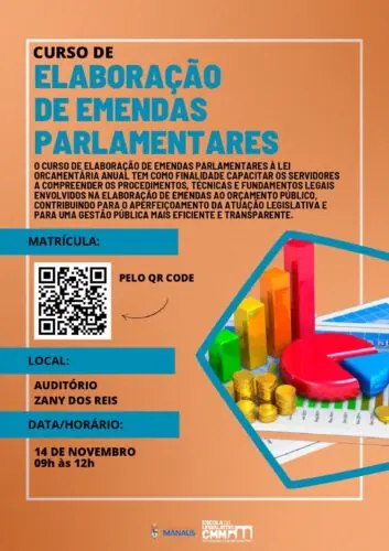 A formação ocorrerá das 9h às 12h, com inscrição gratuita disponível por meio de QR Code do banner de divulgação, e é voltada aos servidores da CMM que atuam direta ou indiretamente com o processo orçamentário e legislativo.