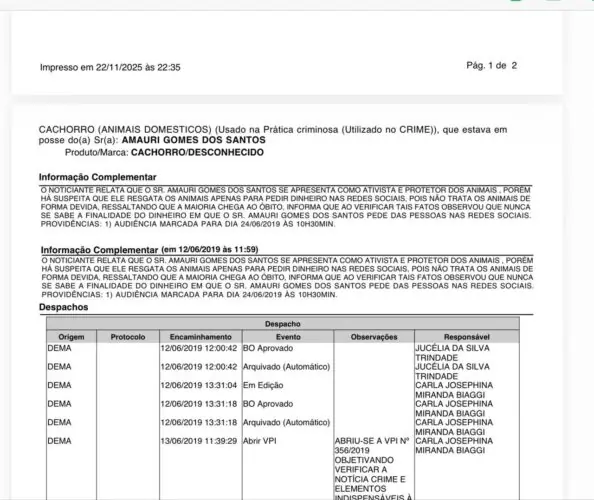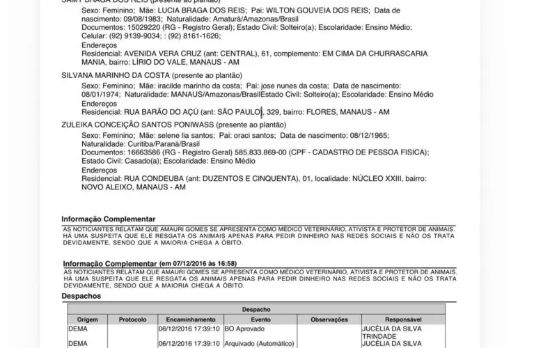 Boletins de ocorrência registrados em 2016 e 2019 indicam que o ex-vereador Amauri Gomes dos Santos já foi alvo de denúncias relacionadas ao uso de animais para arrecadação de recursos e à suposta apresentação como médico veterinário sem comprovação profissional. Os documentos, aos quais a reportagem teve acesso, descrevem relatos semelhantes em ambos os anos, apontando um possível padrão de comportamento.