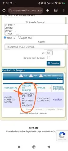Além das denúncias registradas, uma consulta ao sistema do Conselho Regional de Engenharia e Agronomia do Amazonas (CREA-AM) mostra que Amauri possui registro como Engenheiro Eletricista, porém atualmente com status “cancelado por falta de pagamento de anuidade”. Com essa condição, o profissional perde o direito de exercer atividades técnicas que exigem habilitação legal.